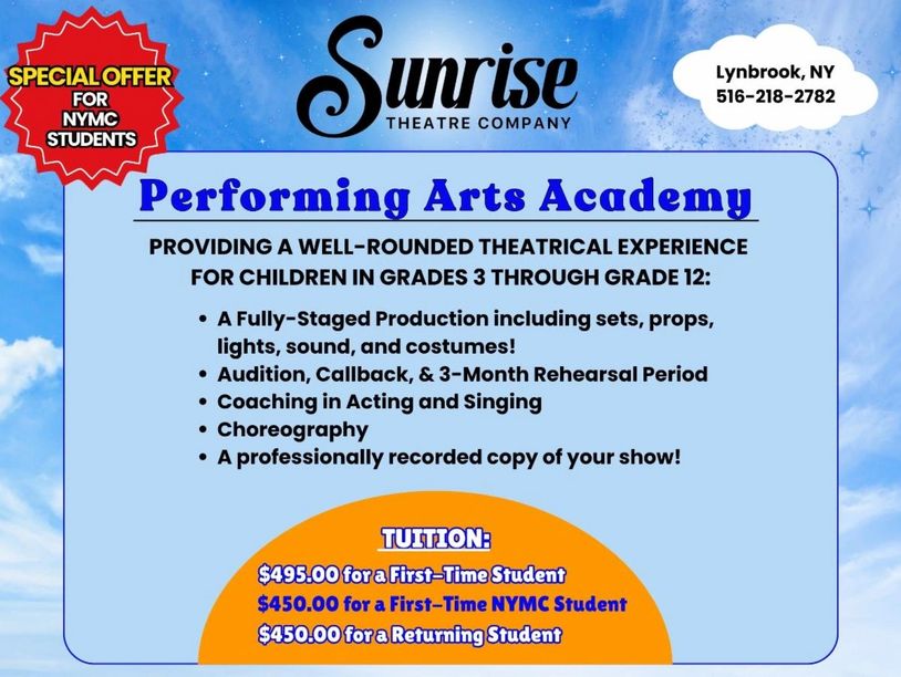 We’re excited to share that our friends at Sunrise Theatre Company are offering NYMC students a special discount to join their Performing Arts Academy in Lynbrook. This program provides students in Grades 3–12 with a fully staged theatrical experience, including: